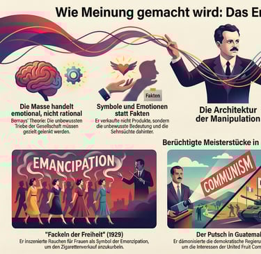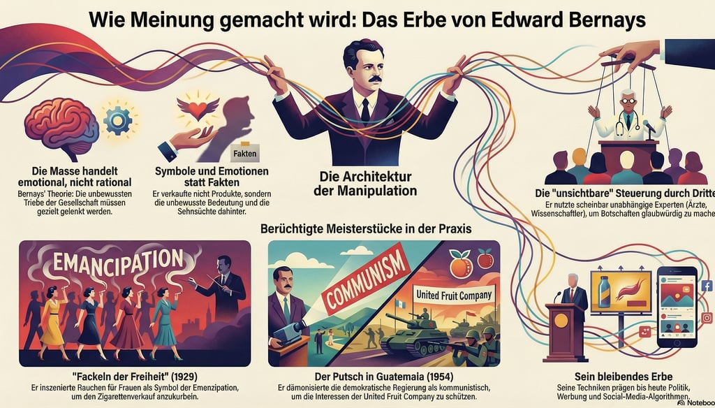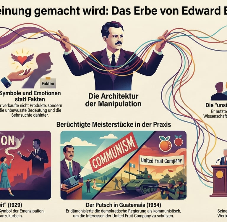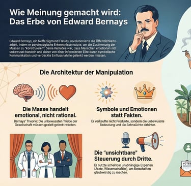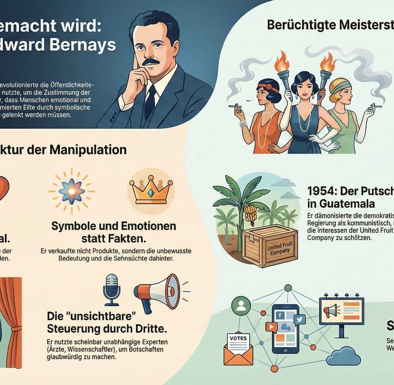 Edward Bernays machte Einfluss zur Technik und gab ihr harmlose Namen. Dieses Video zeigt, wie Symbole, Drittinstanzen und Krisenrahmen Zustimmung erzeugen, ohne wie Druck zu wirken.
